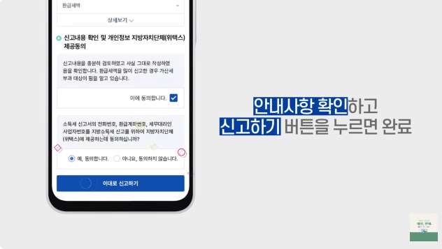 - 신청 완료: 금액 확인 후 '이대로 신고하기' 클릭 → 계좌 정보 확인 후 제출